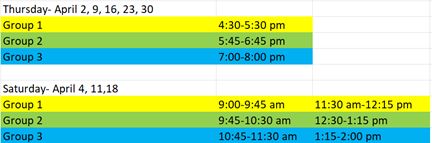 Dates: Thursday evenings and Saturdays in April